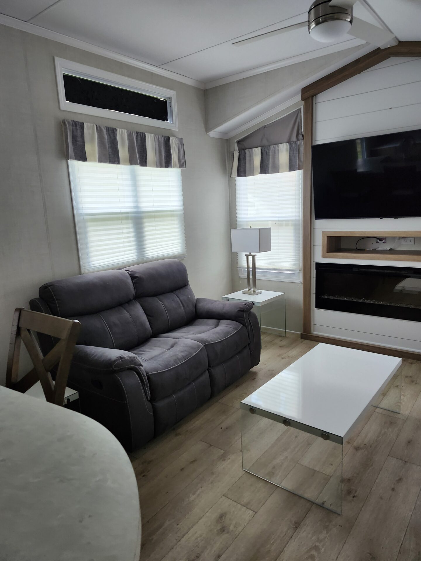 Living room has a large fireplace built-in, with 55inch television and double reclining loveseat.