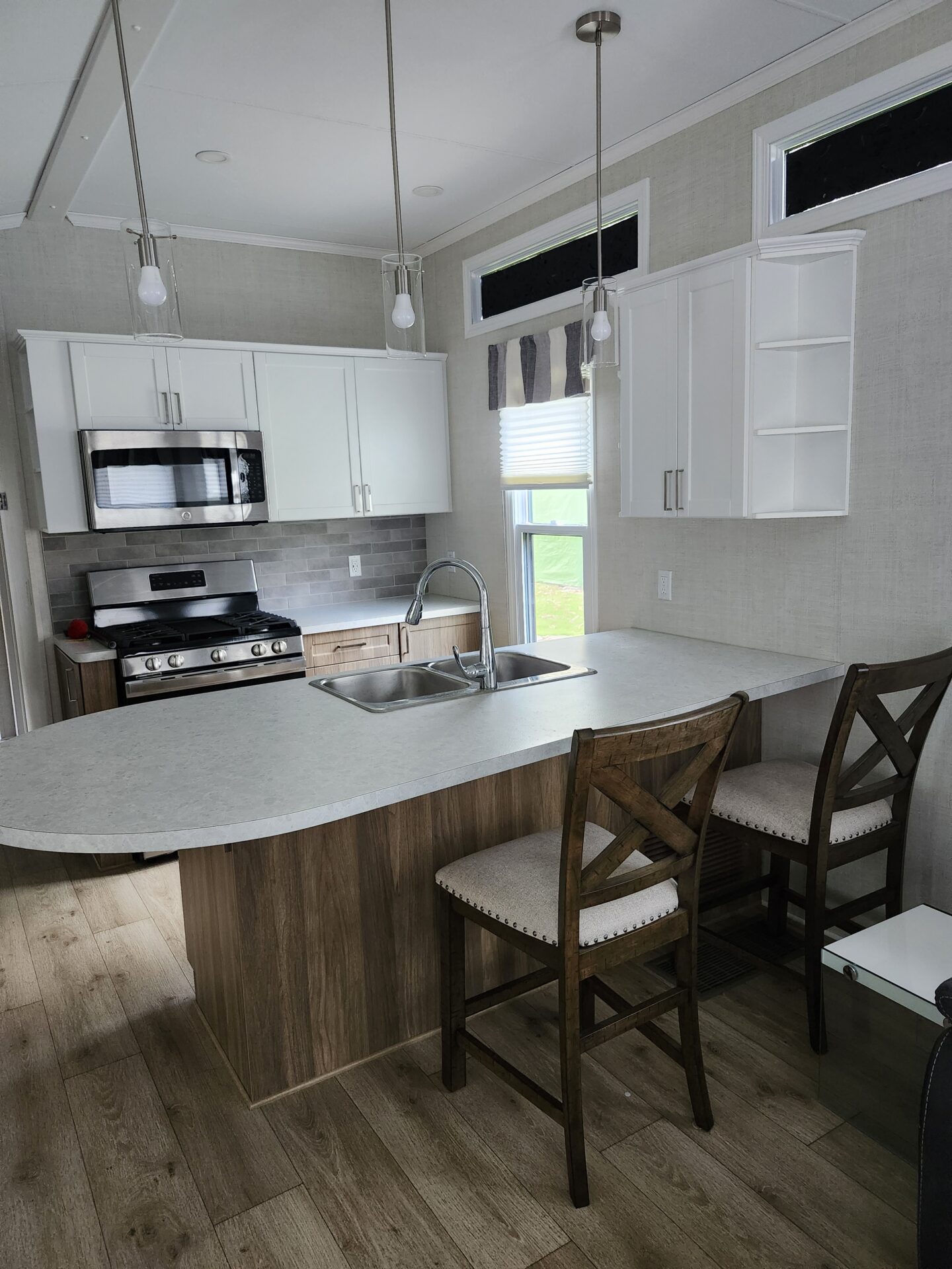 Kitchen comes with full size stainless steel appliances (fridge, stove, microwave), a large island with lots of room to enjoy a meal.