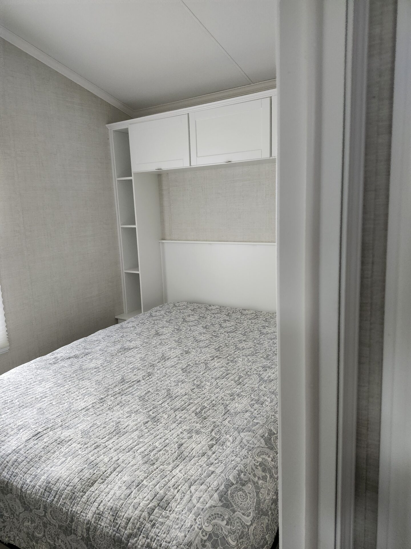 Master bedroom has a queen bed, with lots of built-ins for storage.
