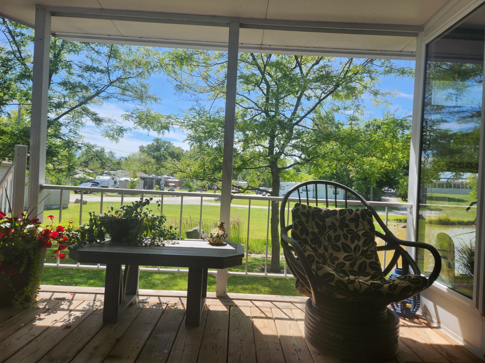 Back deck with awning, table, 4 chairs, and raised garden bed.