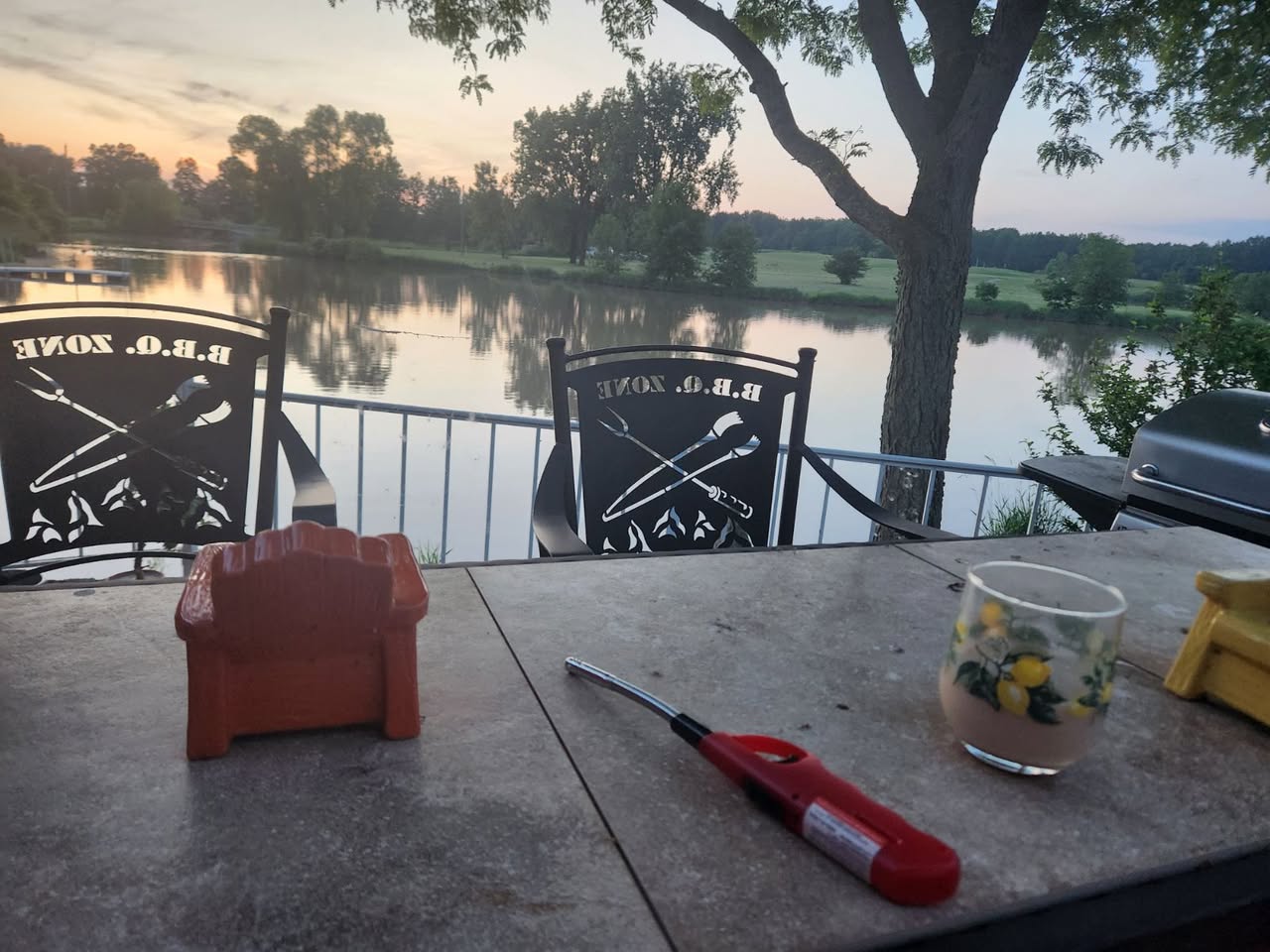 Covered front deck includes: 2 resin Adirondack chairs, small resin table, propane fire table, and fountain.