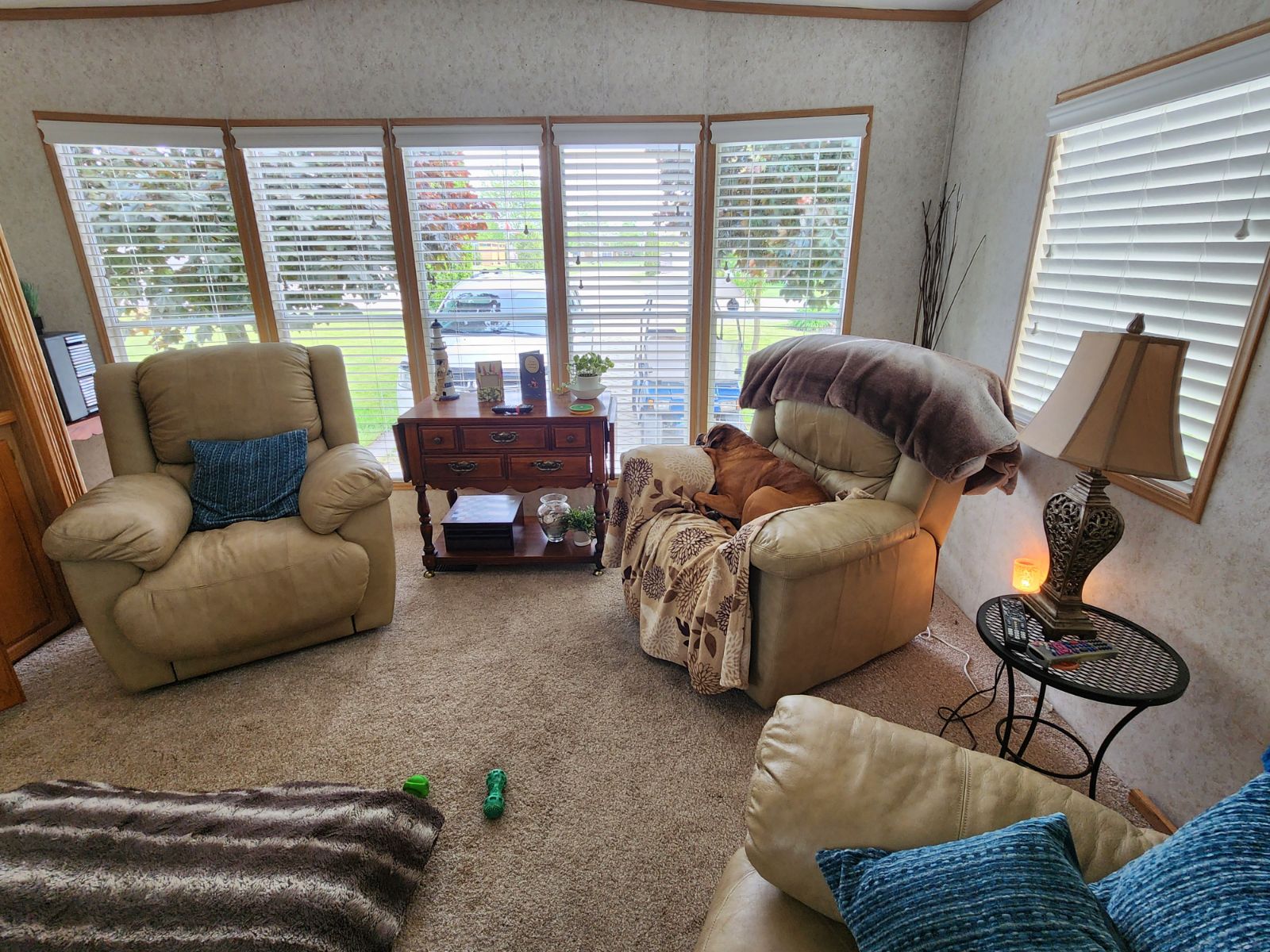 Furnishing in the living room include: 3 Lay-Z-Boy chairs, 1 leather couch, side tables and lamps, coffee table, entertainment cabinet, end table (corner cabinet excluded from the sale)